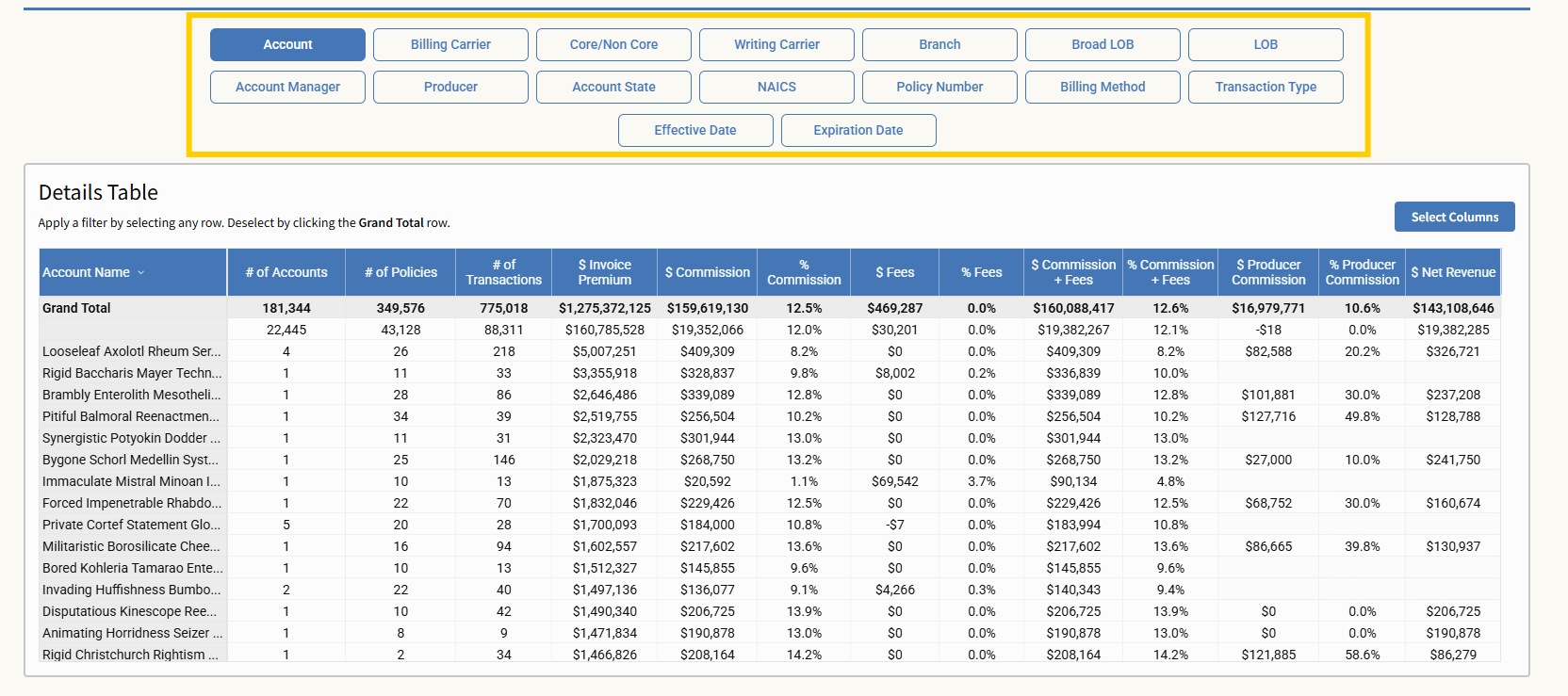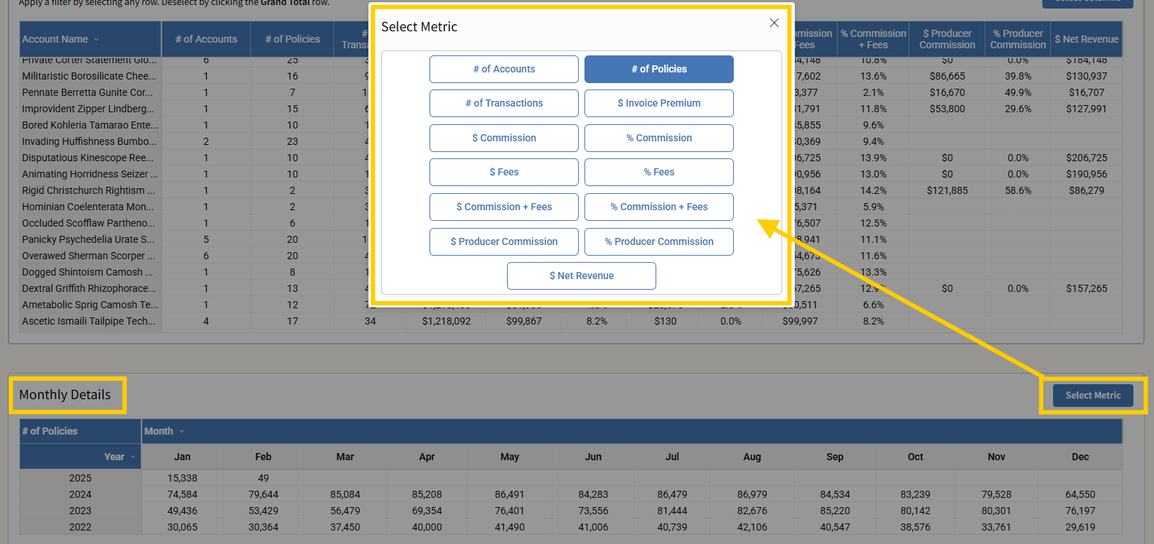 Assess Producer Performance: Filter by Producer or Account Manager to monitor productivity and revenue contribution.