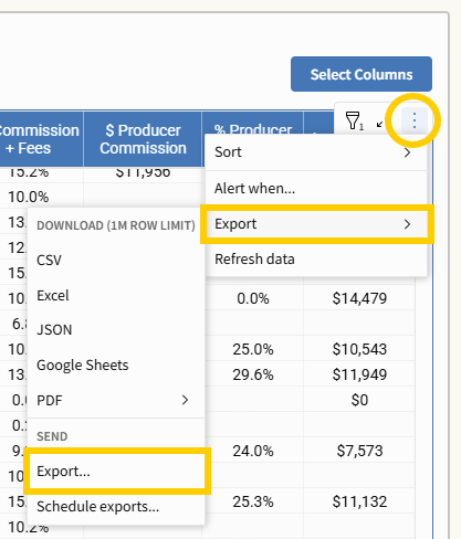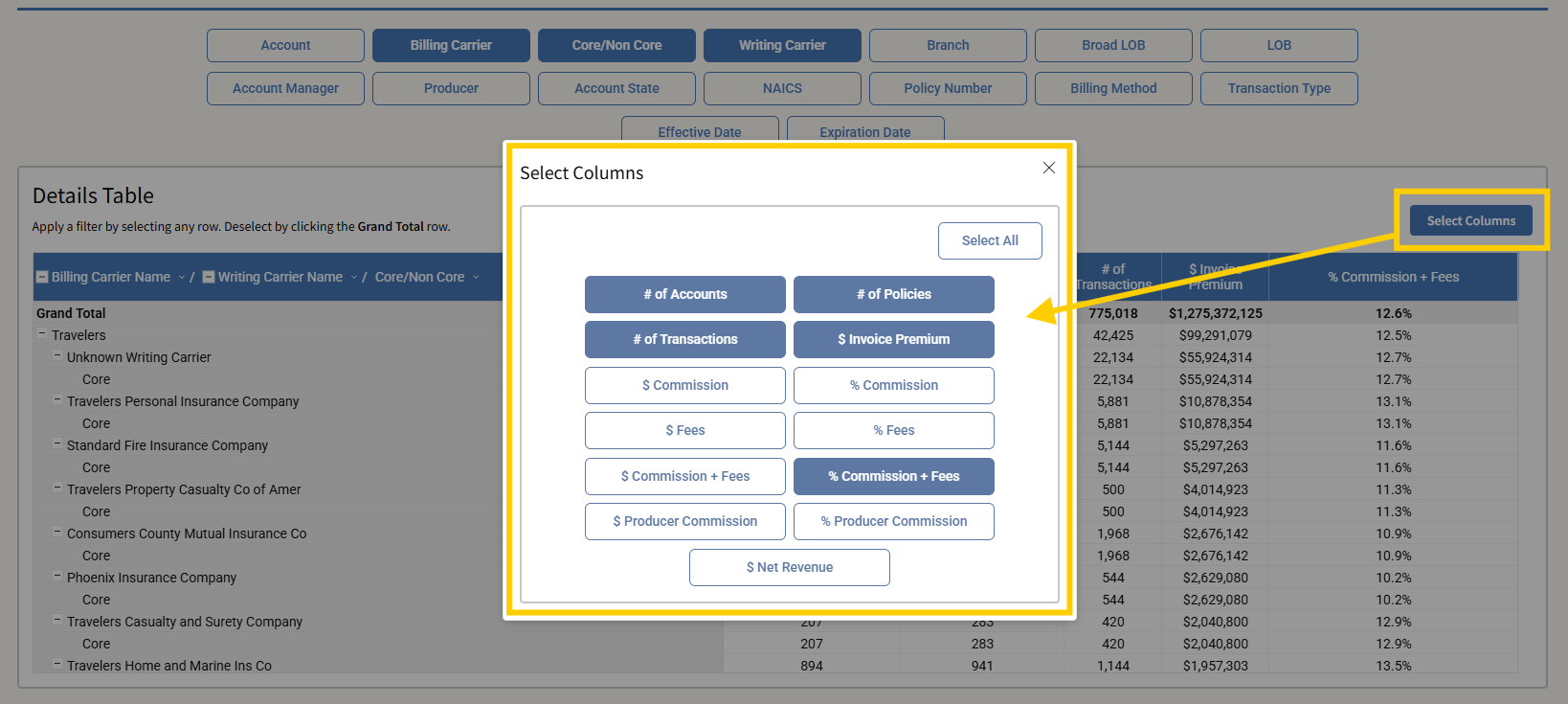 Analyze Commission Trends: Select metrics like $ Commission + Fees to measure top revenue-driving lines of business.