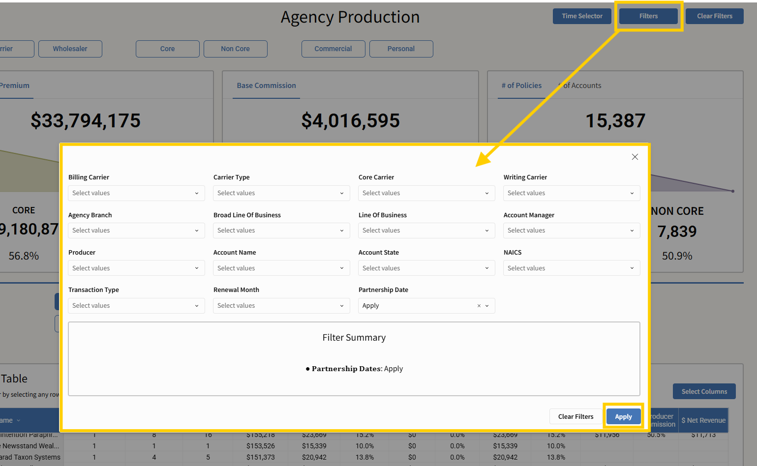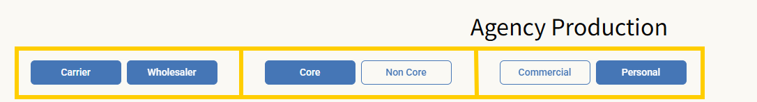 Note: "Clearing filters" will only reset the top three filter sections (Carrier/Wholesaler, Core/Non-Core, Commercial/Personal). Other filters remain unless you choose "reset."