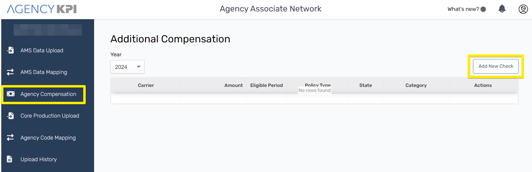 Once on the new page, click 'Agency Compensation,' and then click 'Add New Check' in the upper right of the screen.
