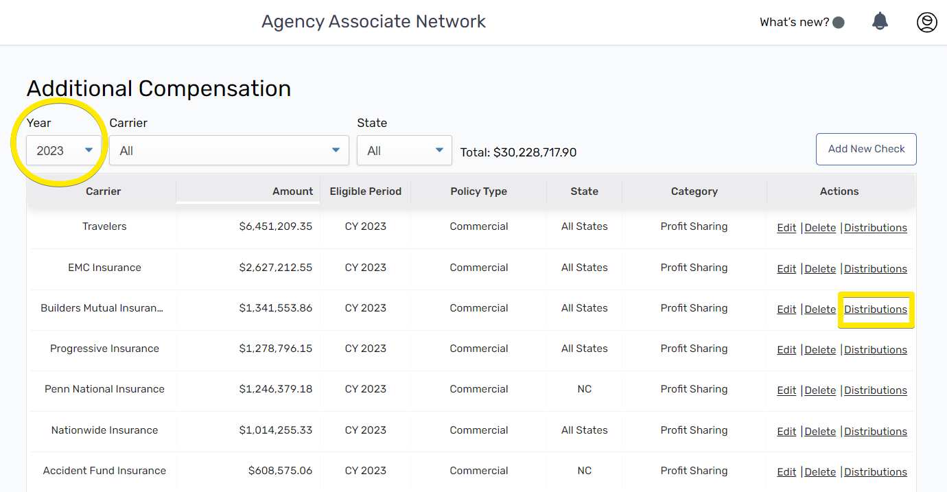 If you chose to bulk upload, your distributions are complete. If you manually loaded the details, locate the check in the list (if loading in a different year than what the check was for, select the appropriate year at the top of the screen). Once located, click 'Distributions' to allocate the funds.