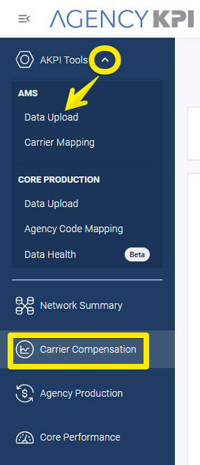 To add additional compensation, click the AKPI Tools drop down in the upper left corner of Harmony, and select 'AMS Data Upload.' You will be directed to different page.