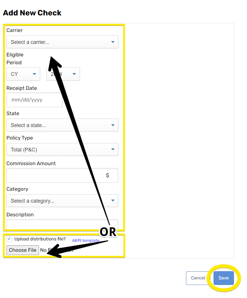Either enter the information manually or check the 'Upload distributions file,' to reveal the 'AKPI template' link to bulk upload your distributions. Click 'Save' in the bottom right of the screen.