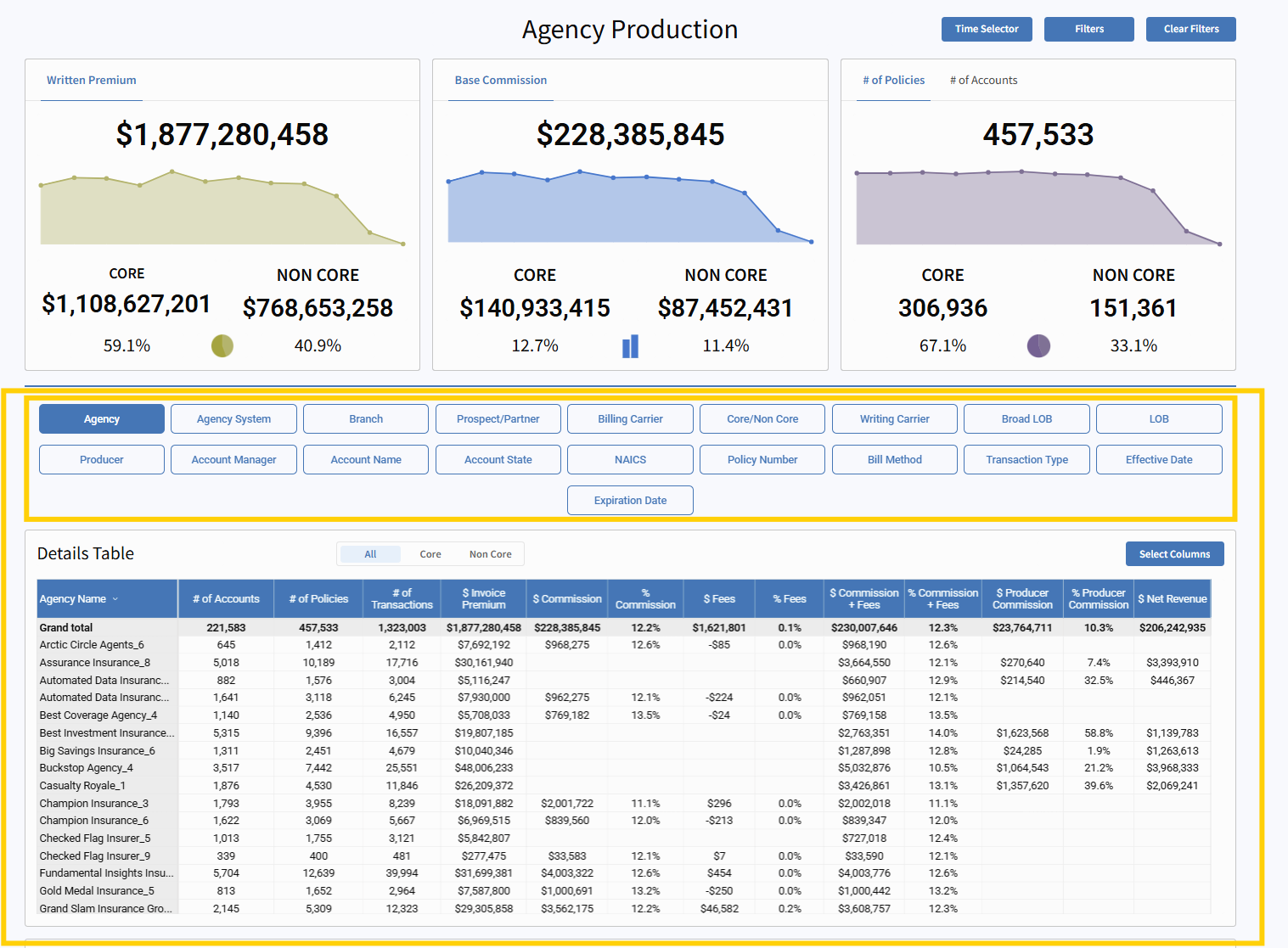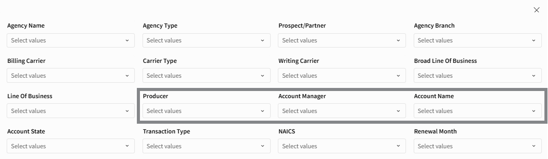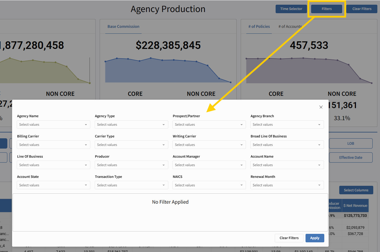 The Agency Production report supports robust multi-select filtering, giving you control over what’s displayed in the table. Available filter categories include: