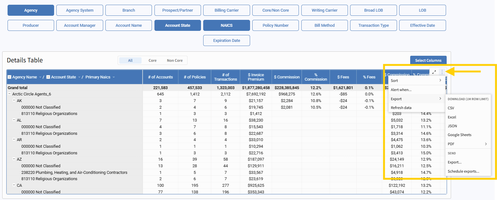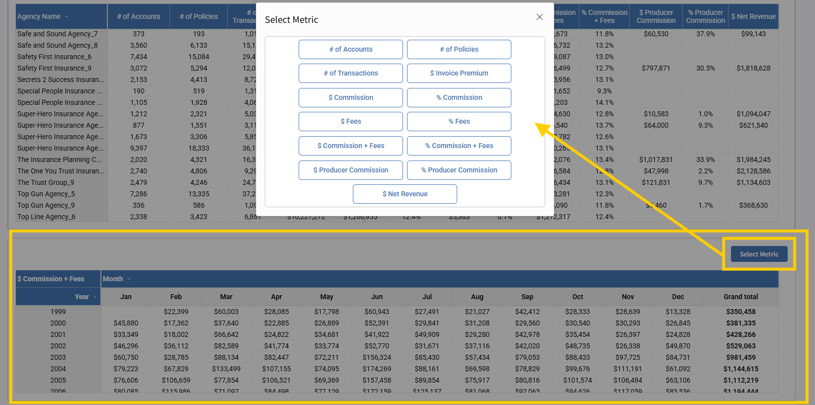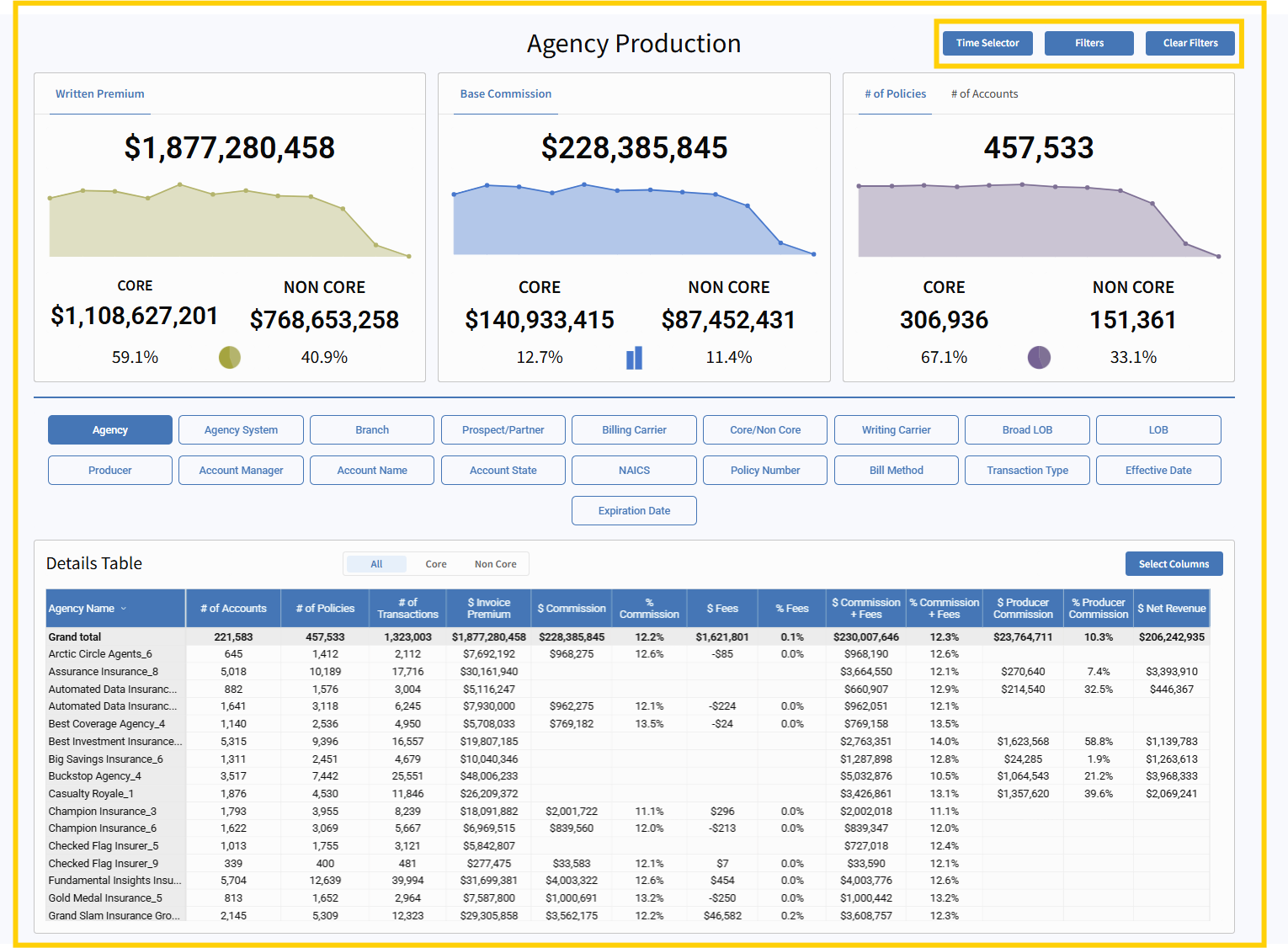 Each user can build a custom view that supports their workflow — whether that’s revenue tracking, producer performance, or account analysis.