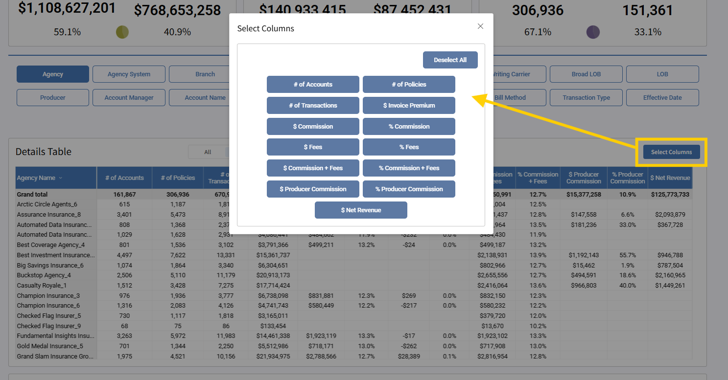 Use the “Select Columns” button to tailor which metrics appear in the Details Table. These include: