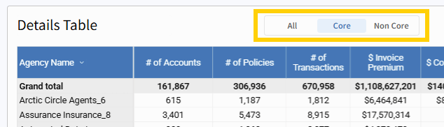 In the Details Table, you can choose between All, Core, and Non Core. This filter only applies to the details table.