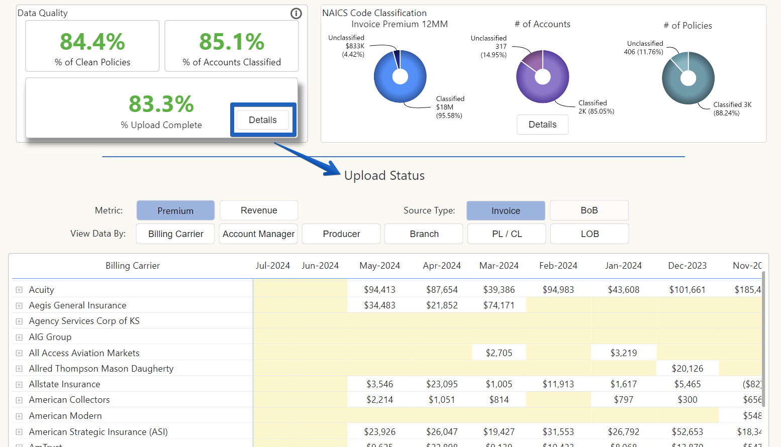 To see the Upload Status of your files click the “Details” button on the Data Quality tab