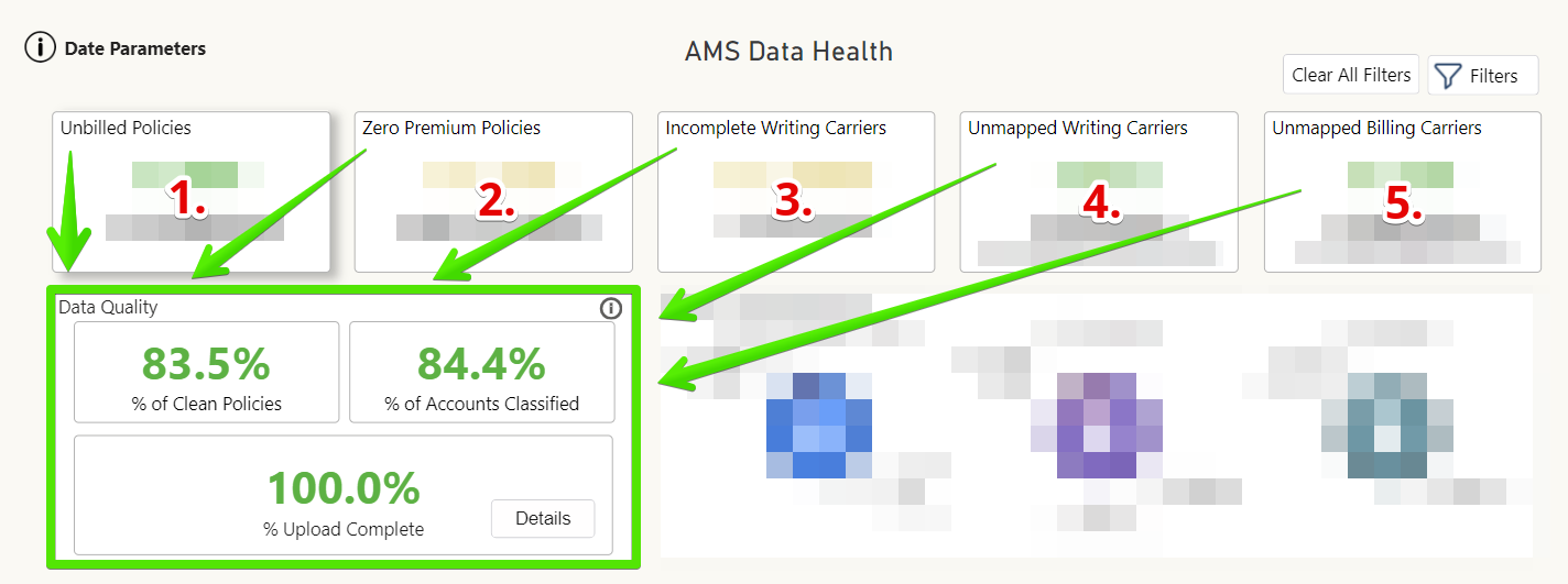 Use the Data Quality table to track your AMS data integrity. This table will continue to improve based on your work with the five cards located above it. Working through each of those will increase your percentages in the Data Quality table.