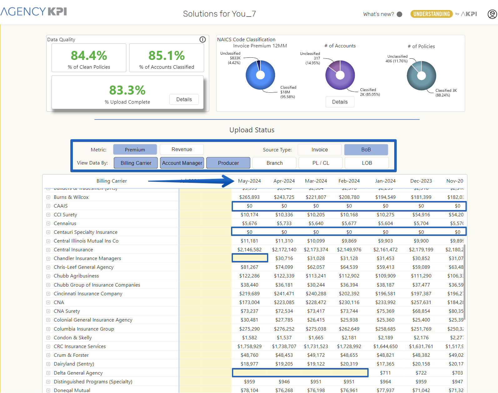 - Next make selections to “View Data By.” You may multi select these; Billing Carrier, Account Manager, Producer, Branch, PL/CL, and/or LOB, the order in which they are selected will be the order of the drop-down table.
