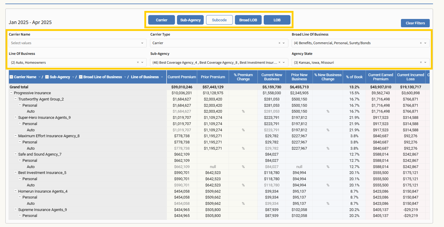 The bottom table allows for quick metric selection by Carrier, Sub-Agency, Subcode, Broad LOB, and LOB. The order of these clicks determines the drop down order in the chart. Additional filtering by Carrier Name, Carrier Type, Broad Line of Business, Line of Business, Sub‑Agency, and Agency State allows you to narrow your search; all these filters apply only to this table.