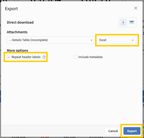 Select Excel as the file format.