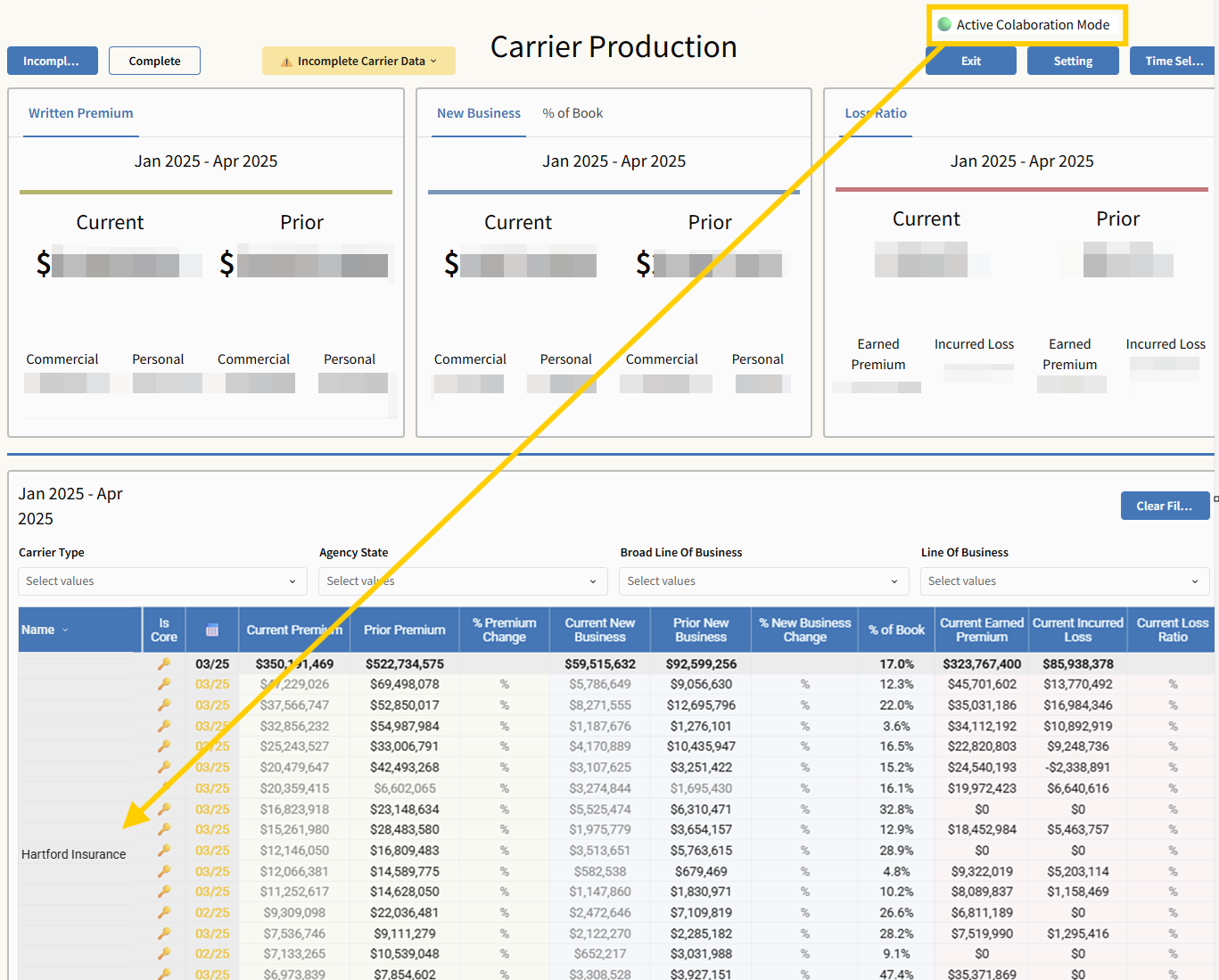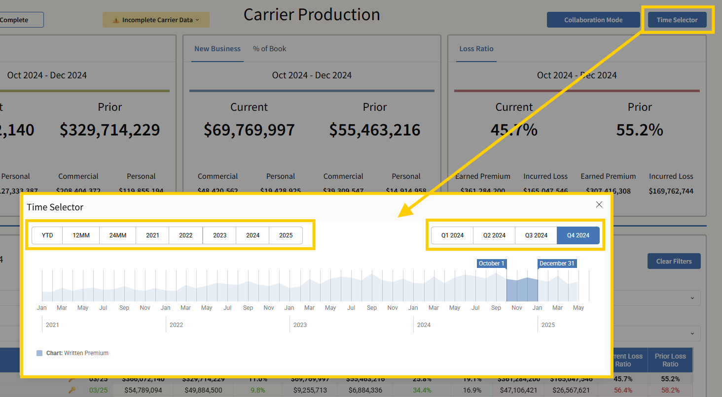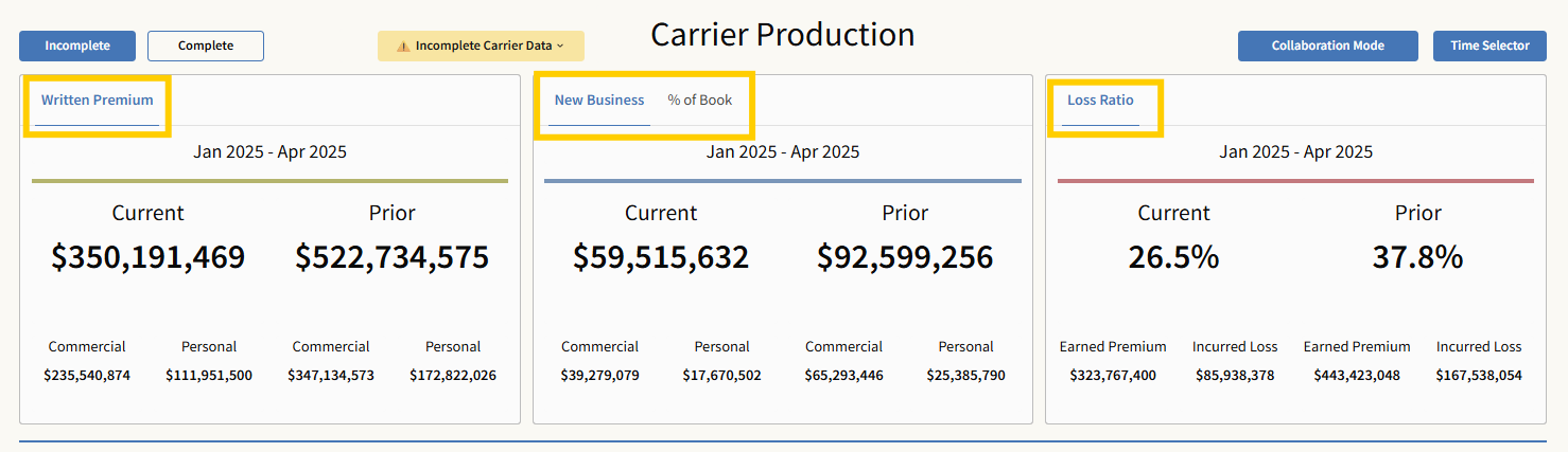 The top summary cards (Written Premium, New Business, Percentage of Book, Loss Ratio) update based on timeframe, and completeness setting—they are not affected by table filters.