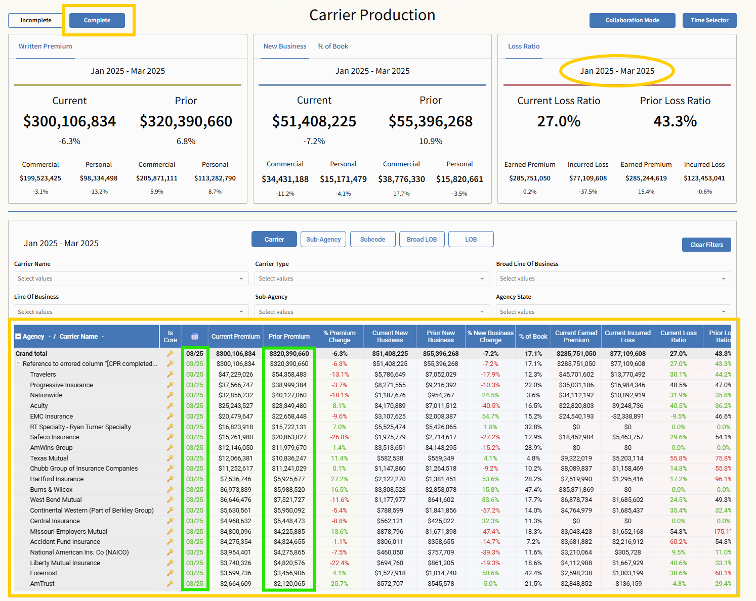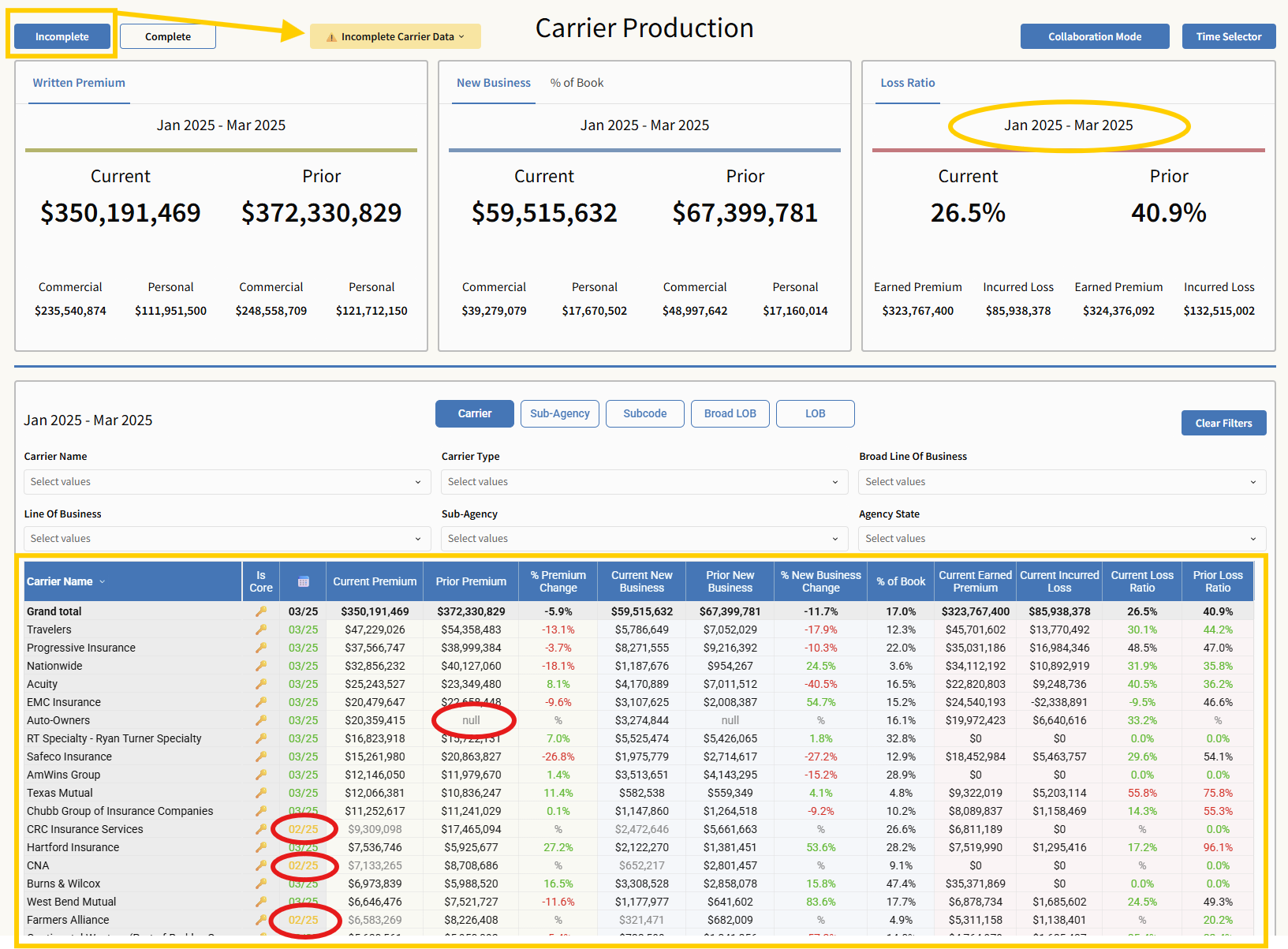 Complete removes the indicator and filters the view to show only carriers with full monthly reporting—this affects both summary cards and the table.
