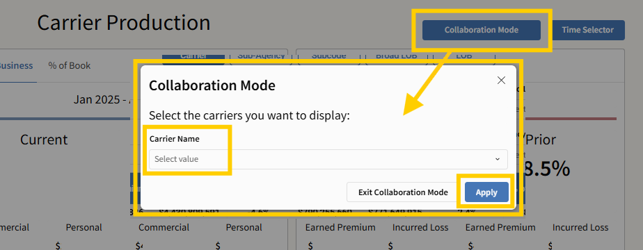 Carrier Production brings together your monthly Network/Aggregator uploads and flexible reporting tools—enabling you to track, analyze, and share performance by carrier, line of business, and timeframe. With dynamic metrics, detailed filters, export options, and focused collaboration mode, this dashboard equips you to turn insight into action confidently.