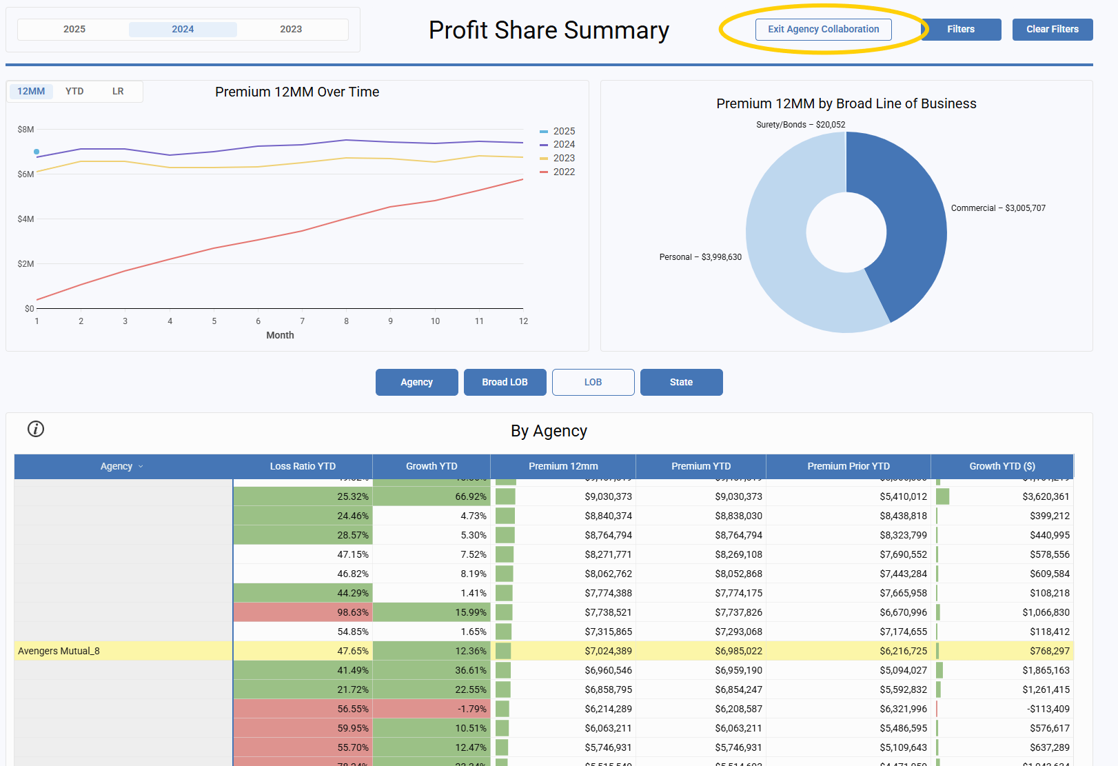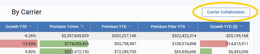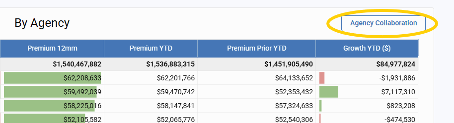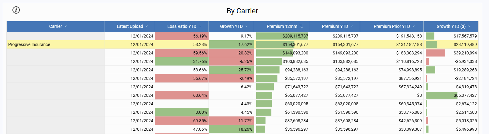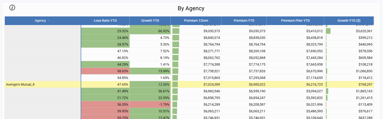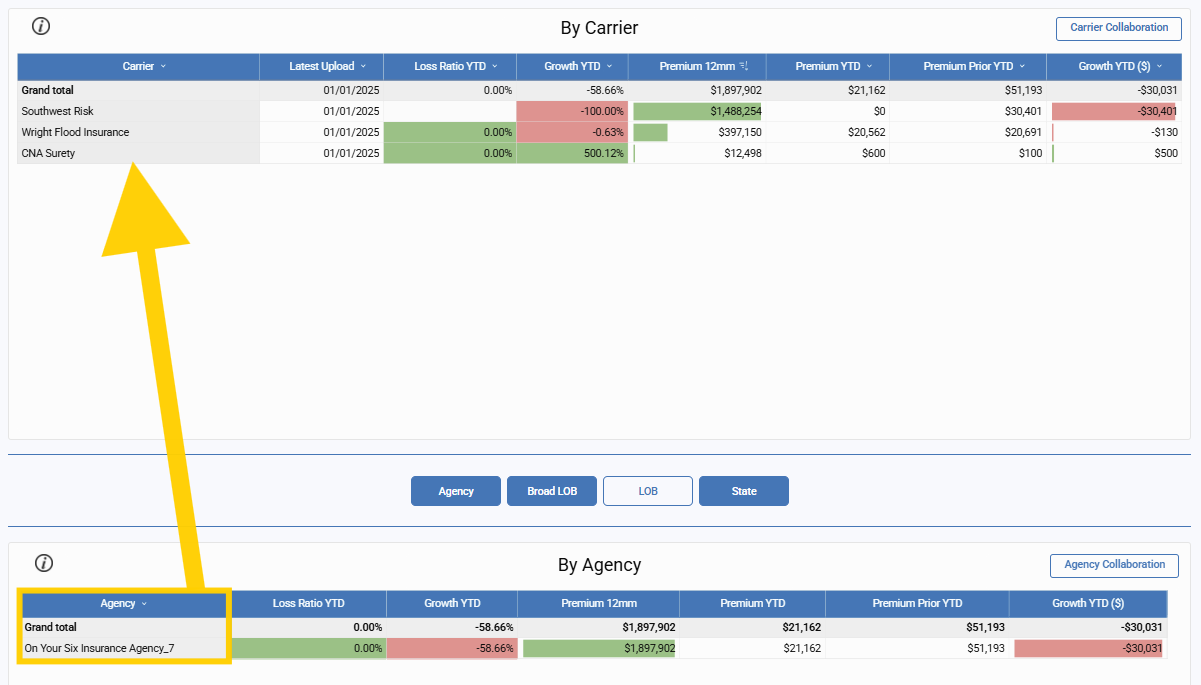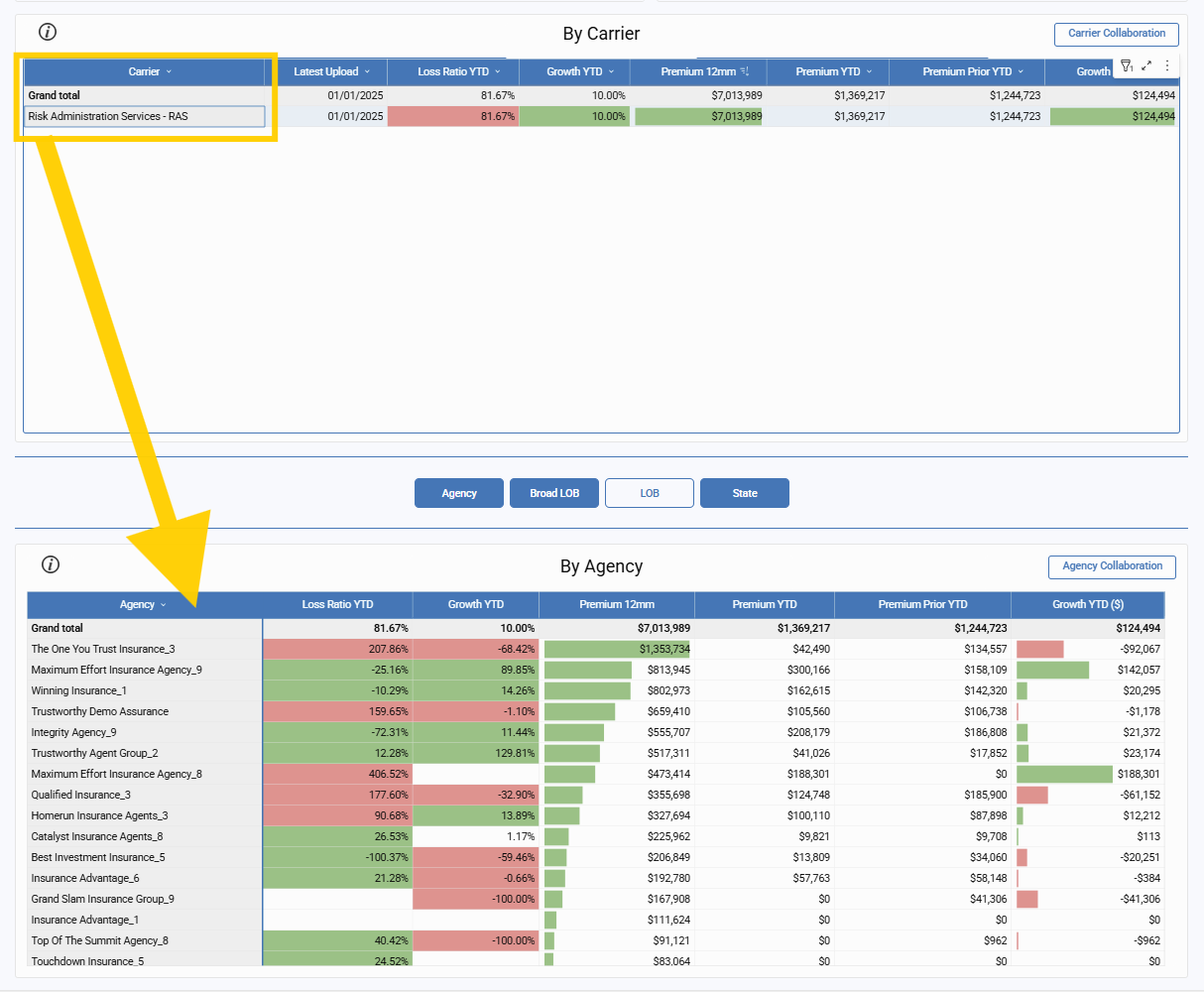 If you’re reviewing a specific Carrier, click its name to filter the Agency table. Then sort by Growth or Loss Ratio to identify top performers or agencies needing attention.