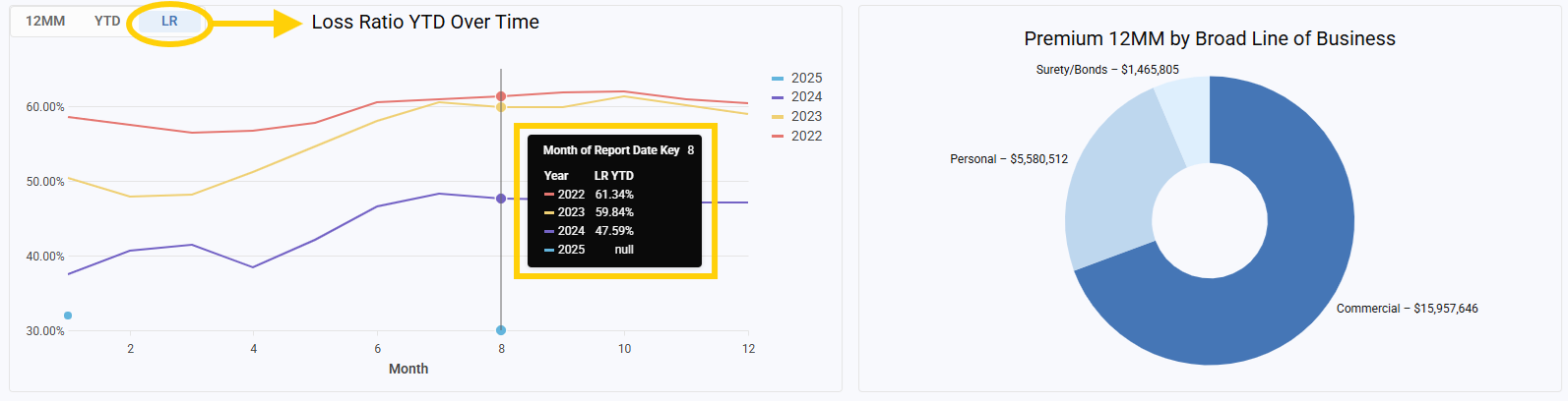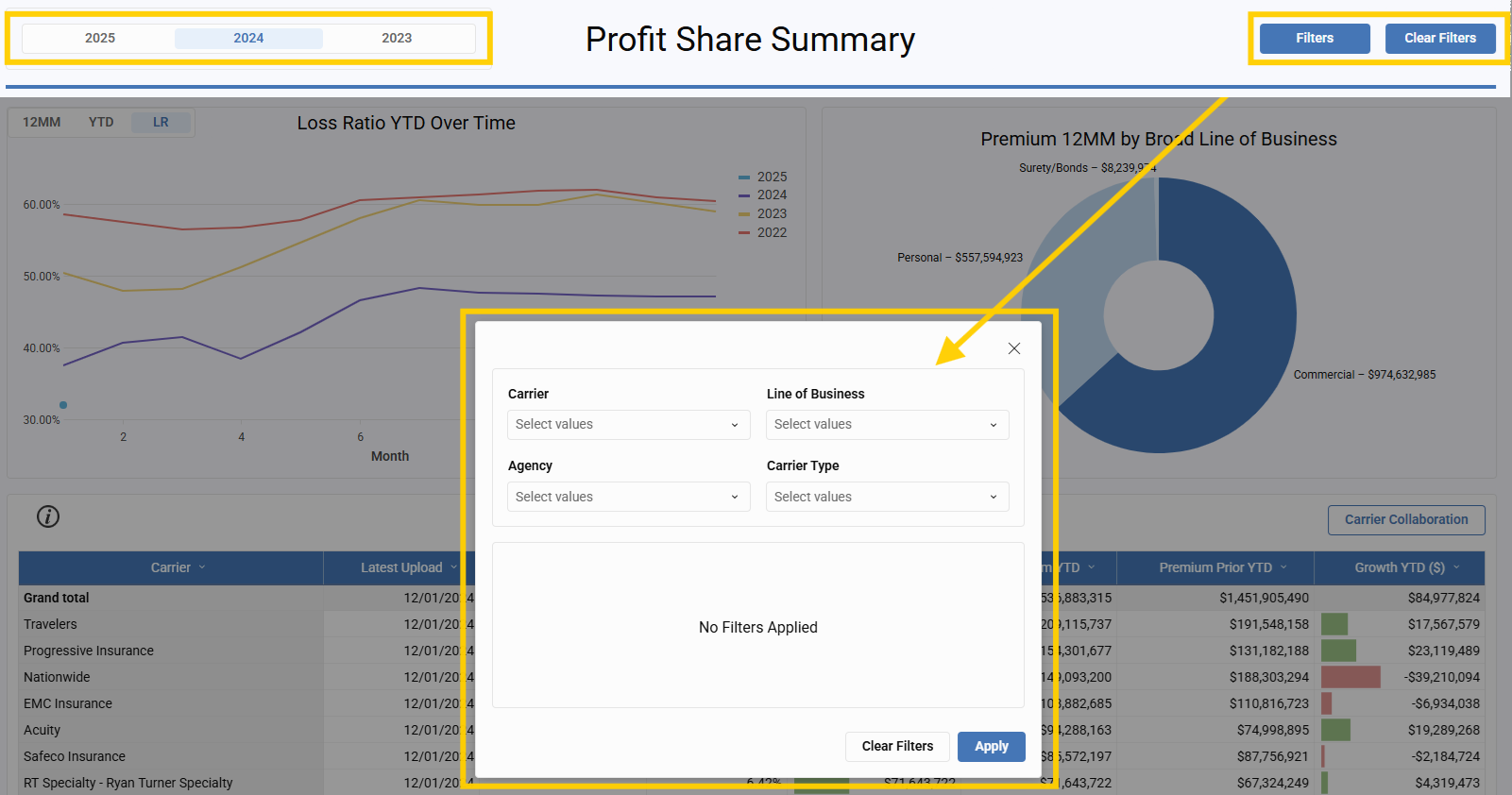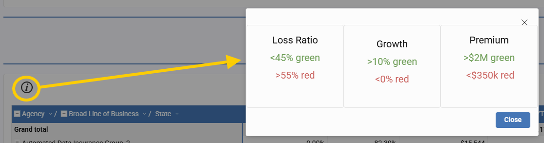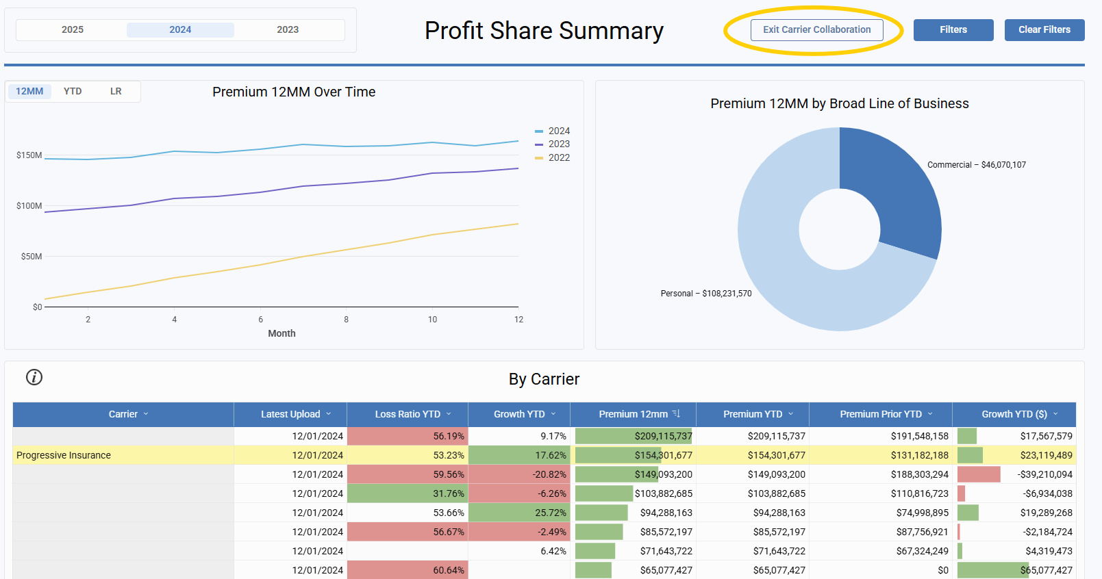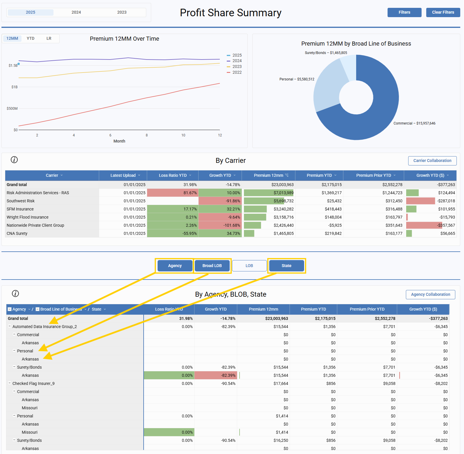 If you’re reviewing a specific Carrier, click its name to filter the Agency table. Then sort by Growth or Loss Ratio to identify top performers or agencies needing attention.