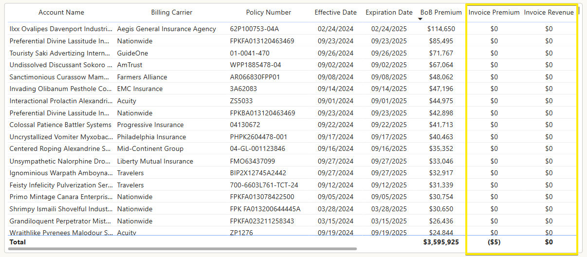 - Identify all active policies that have not received commission in the table at the bottom of the page, look at the far right columns Invoice Premium and Invoice Revenue.
