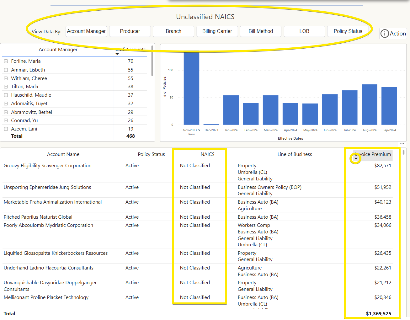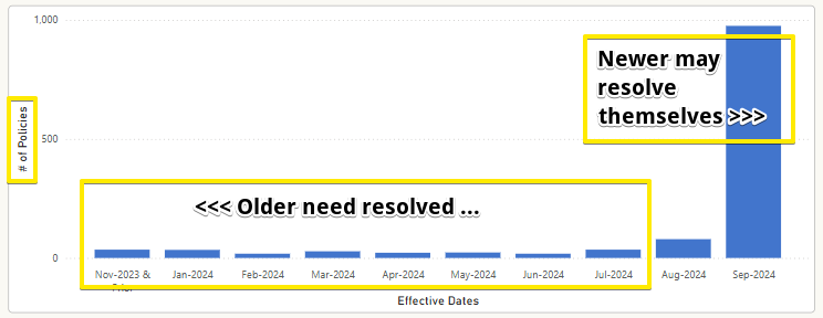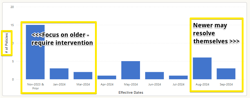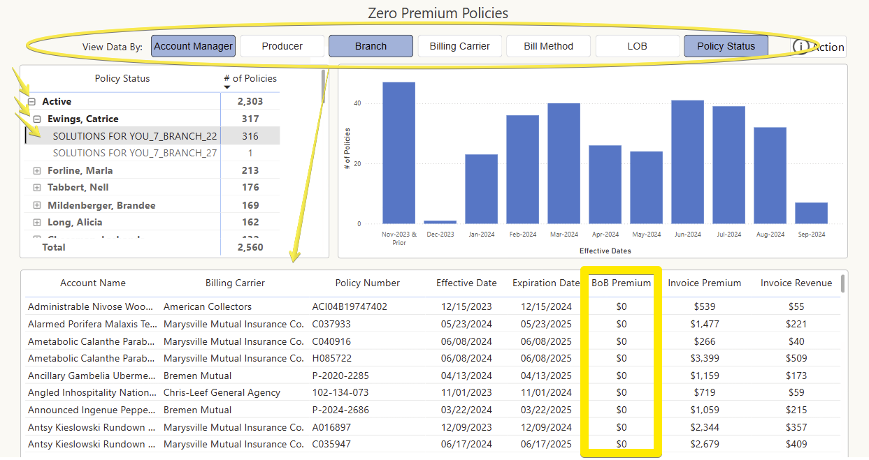 - In the bar chart "# of Policies" focus on the older effective dates to the left of the chart. Items to the left should be far less than items to the right which represents your most recent load, where policies have just renewed. Most of these should resolve themselves. However those to the left of the chart will need your intervention. Multi select the bar chart by holding down control on your keyboard and clicking each column you wish to view in the table at the bottom of the page. Then analyze the data based off your preference - By Account Manager, Producer, Branch, Billing Carrier, Bill Method, LOB, or by Policy Status.