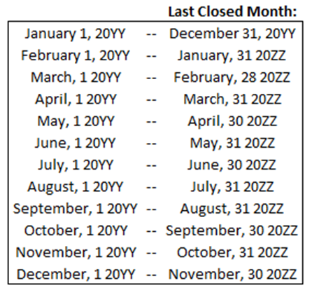 All Production reports require a rolling 12 months time frame. Use the table below as a quick reference of from and through dates.