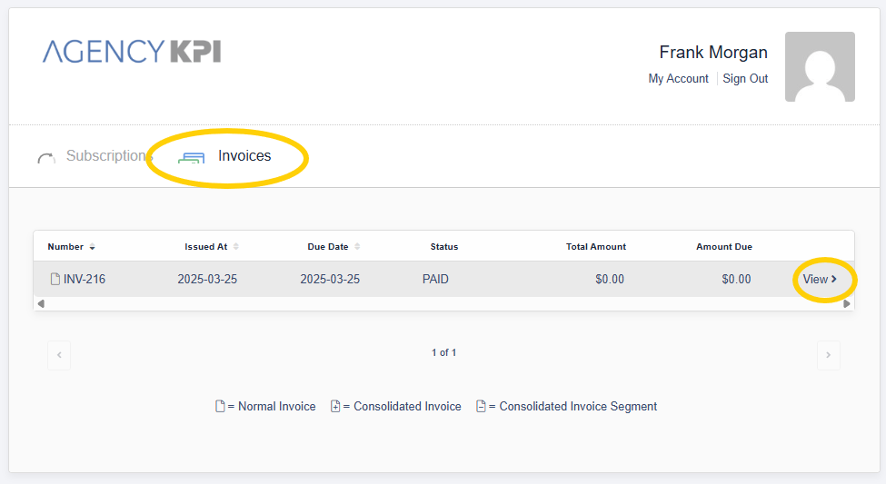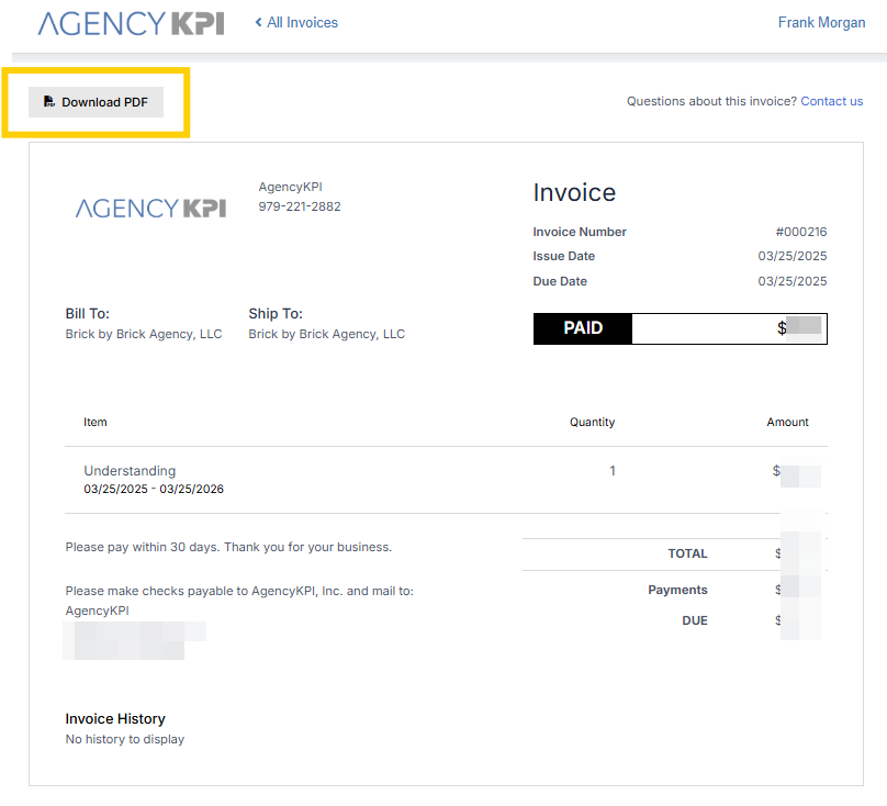 To review past payments, click the Invoices tab at the top-left of the page. Then: