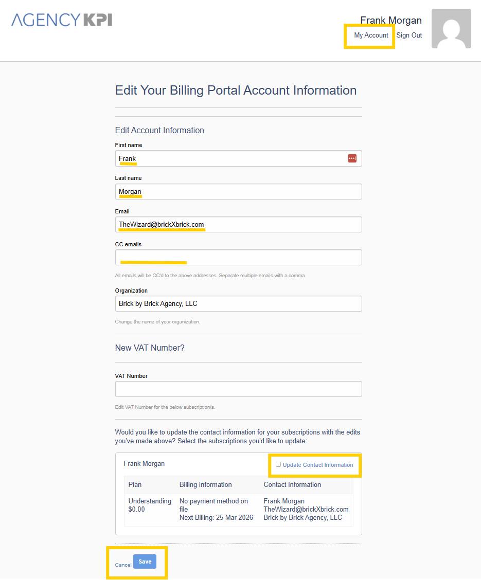 To update contact details, click My Account next to your profile icon. You can edit your name and contact info here. Don’t forget to click Save when finished.