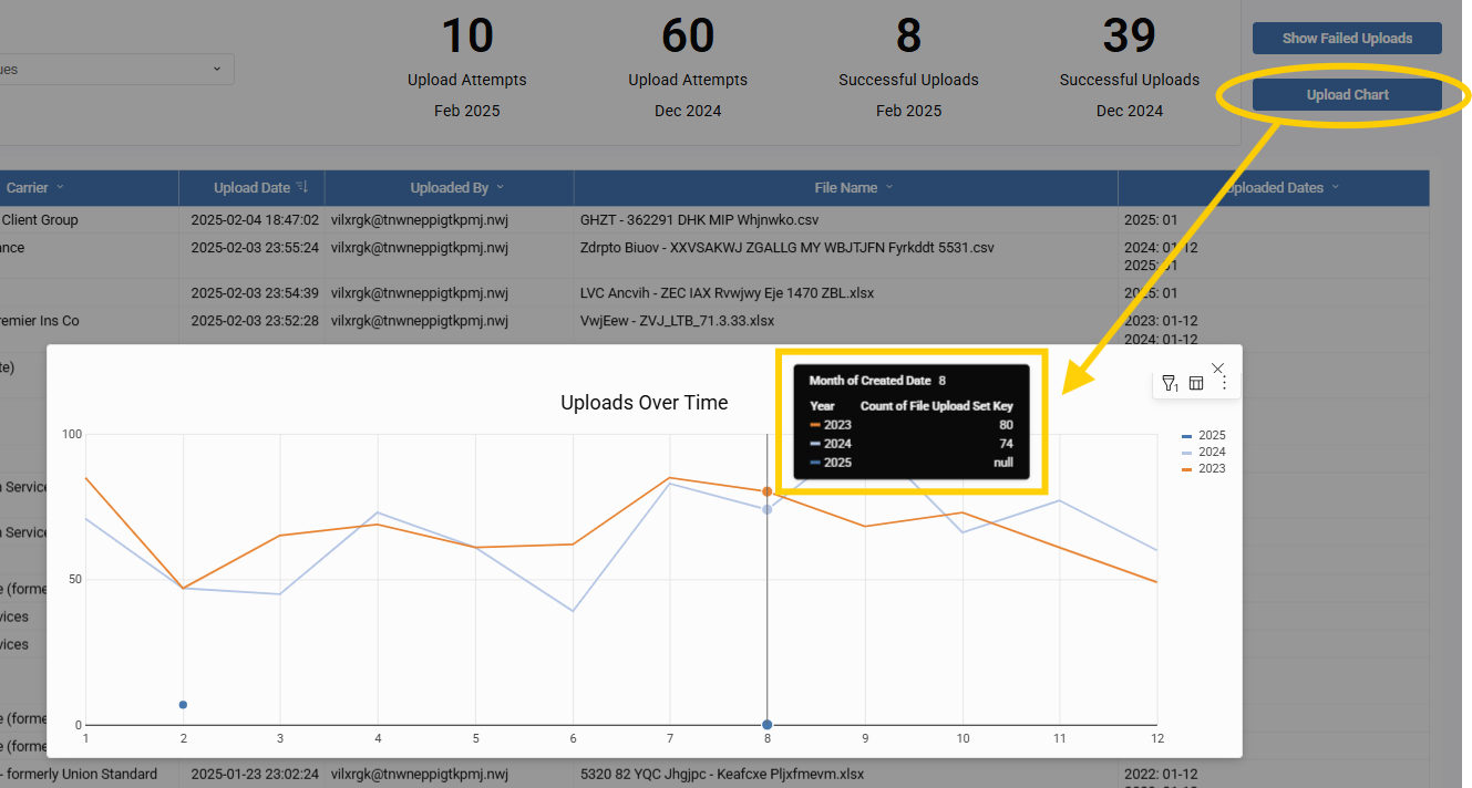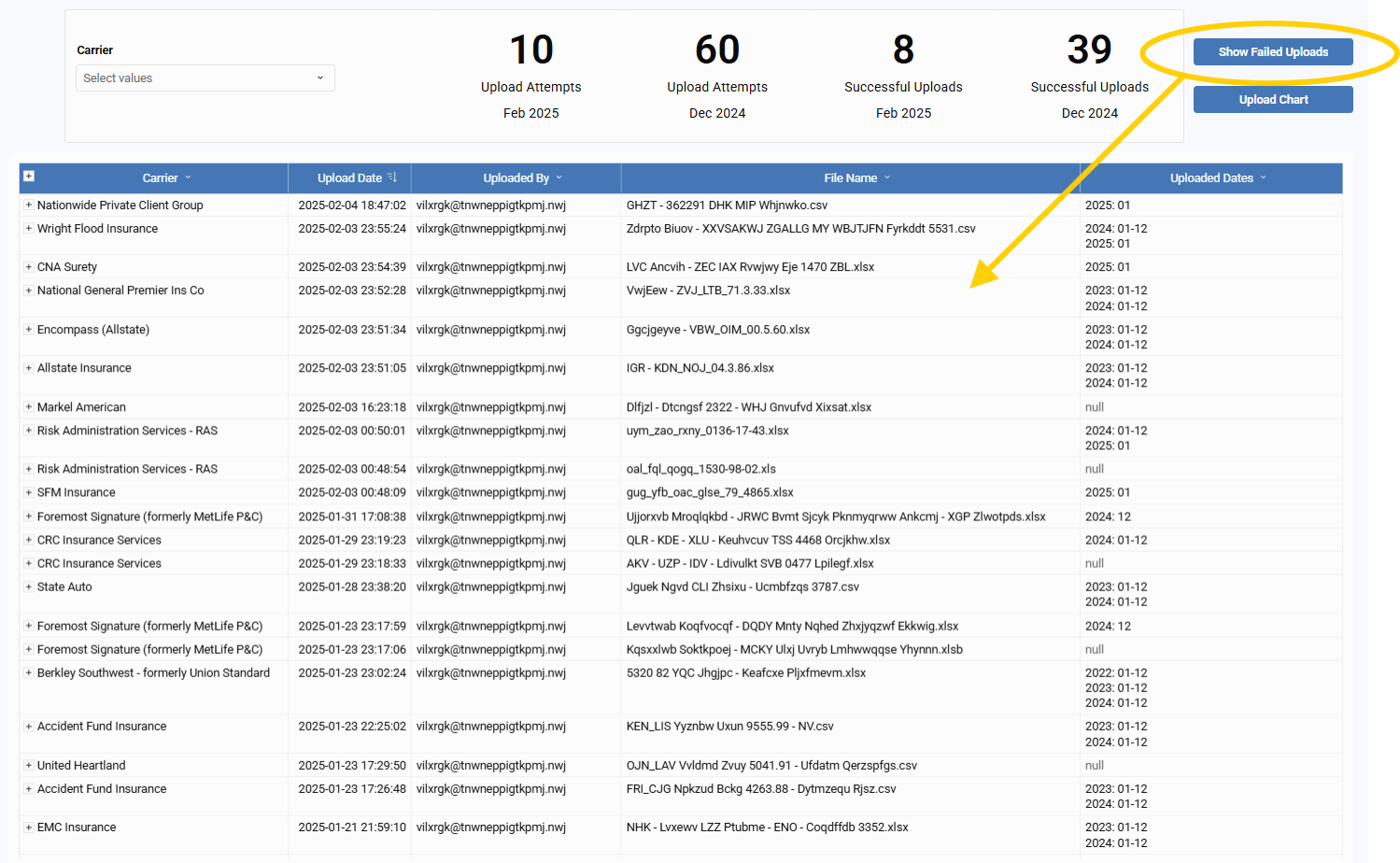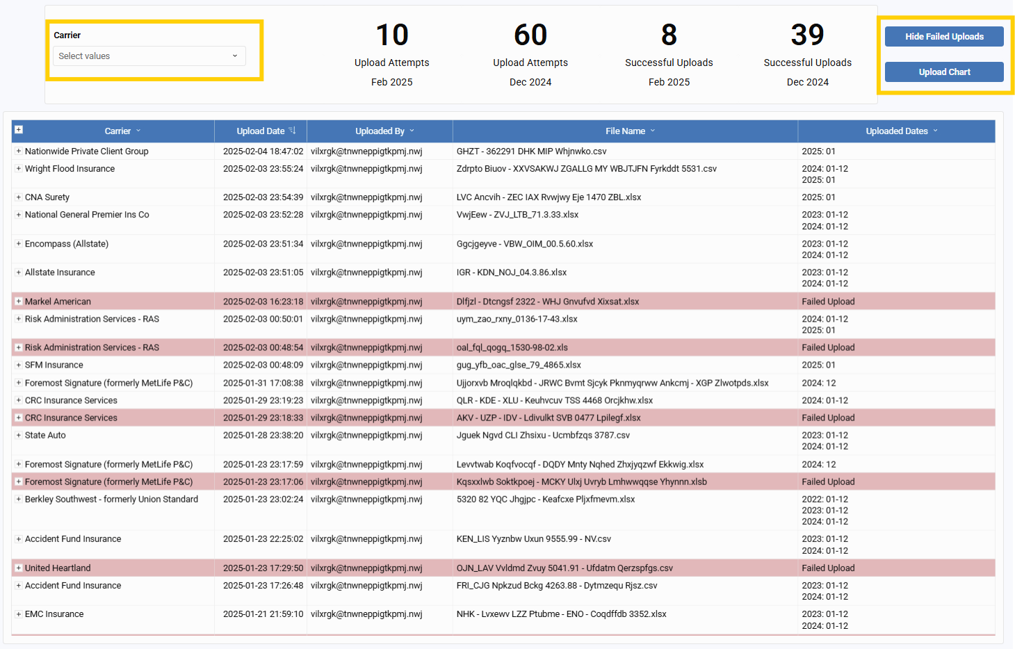 Track upload success in a flash. Filter by carrier to verify uploads, review who uploaded what, and instantly flag any issues (failures show in red).