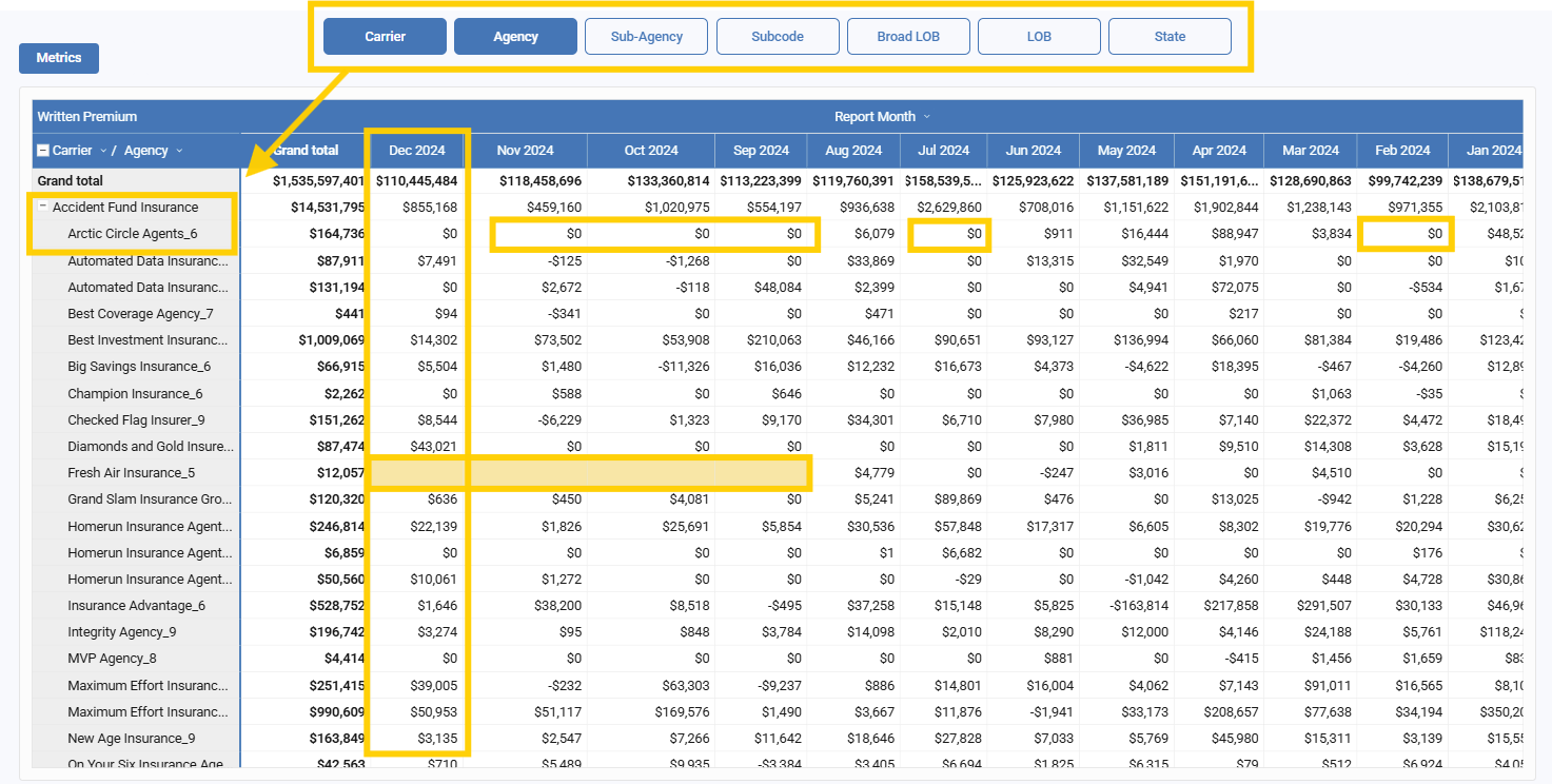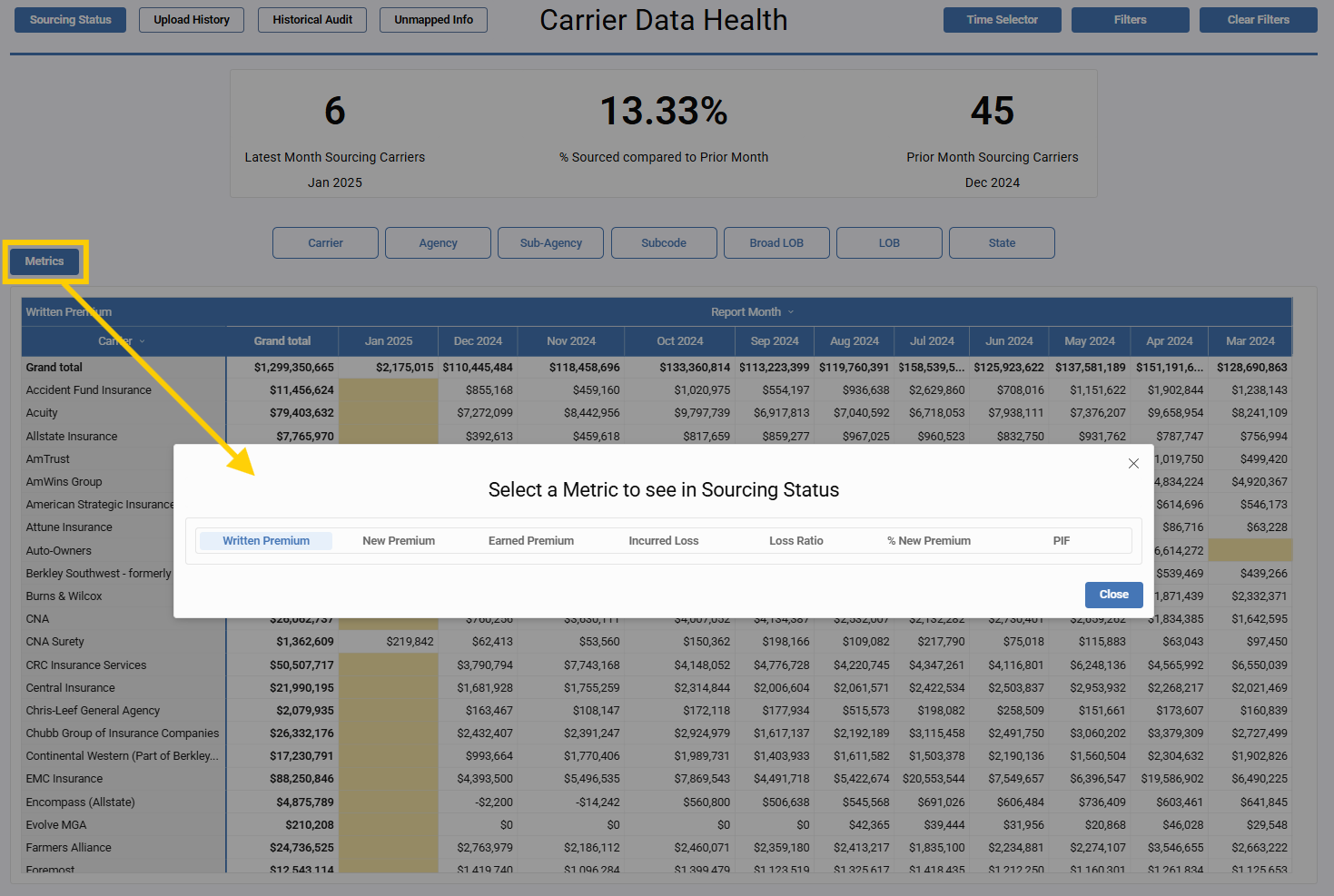 View all sourced values across your Carrier Production uploads in a single report. Filter by time frame and metric (like Written Premium or Policies in Force), then drill into the data by Carrier, Agency, Branch, and more.