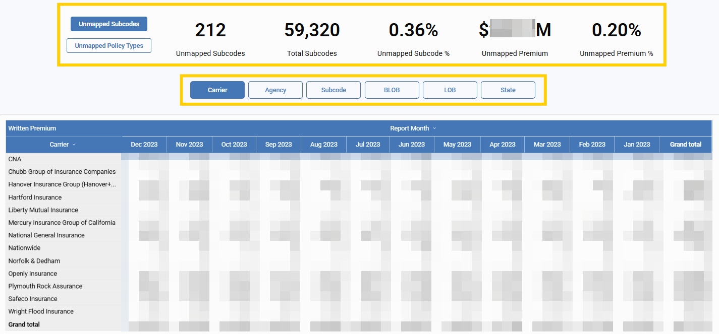 The Unmapped tab gives you a quick glance at any data that hasn’t been mapped at all. You can toggle between unmapped Subcodes or Policy Types, then break it down further by filters like Carrier, Unmapped Agency, LOB, or State.