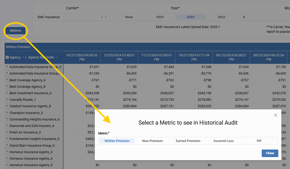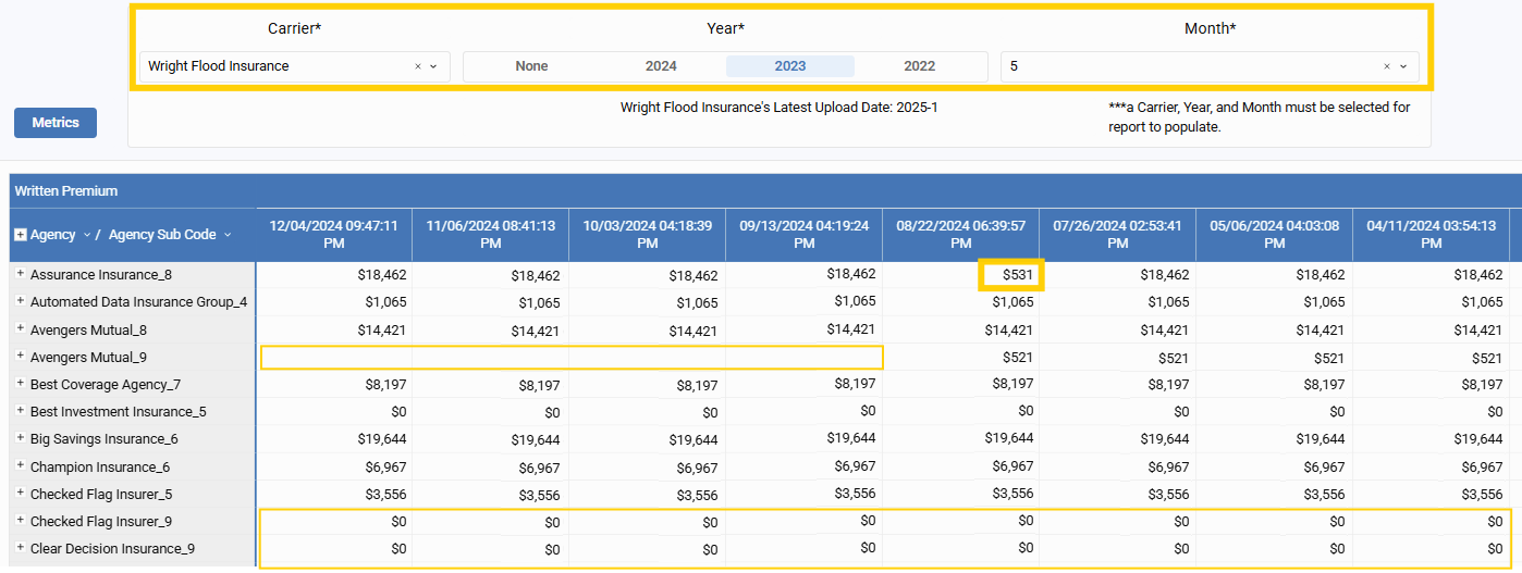 If a carrier has reported the same Written Premium for May 2023 over the last two years, and that value suddenly changes or disappears in the latest upload, Historical Audit helps you catch that discrepancy quickly and verify its accuracy.