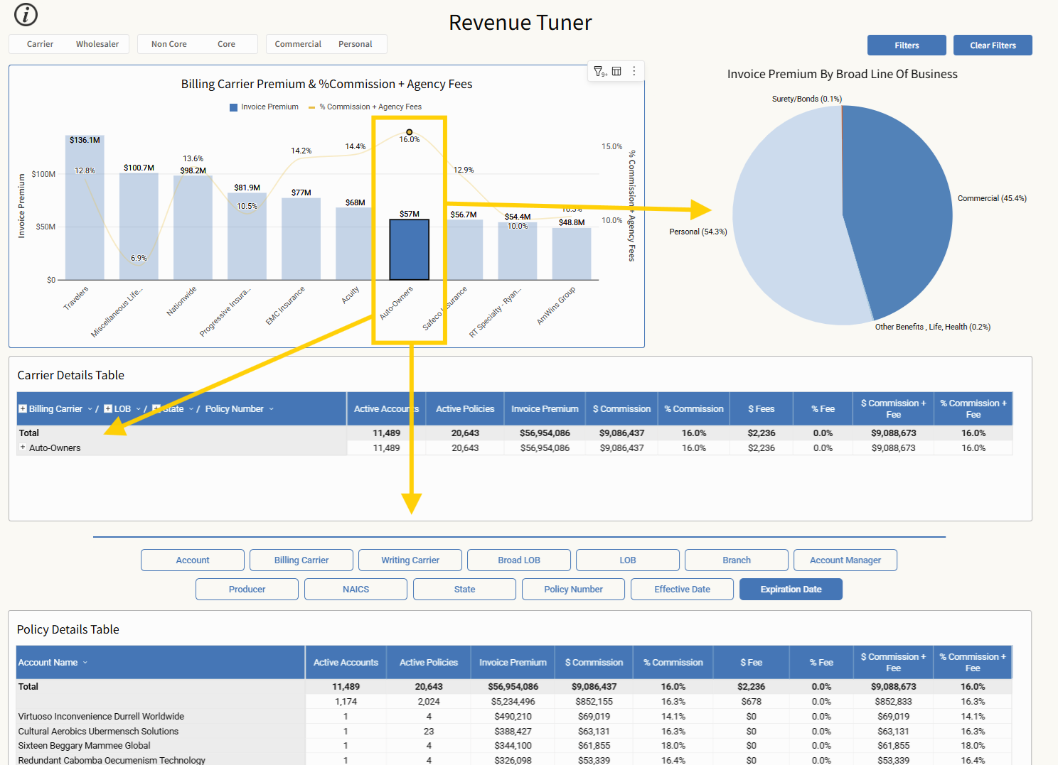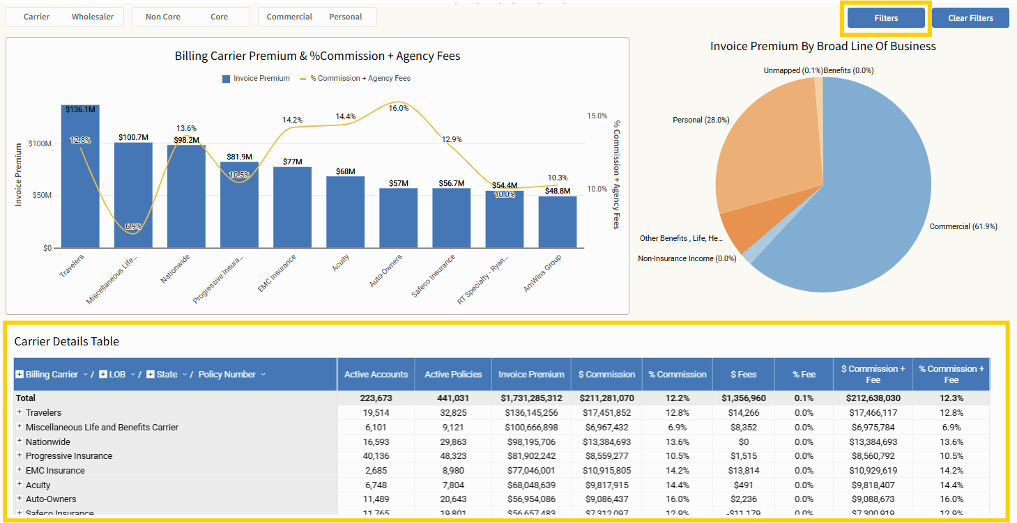 At the top, the “Billing Carrier Premium & % Commission + Agency Fees” bar chart acts as a live filter: