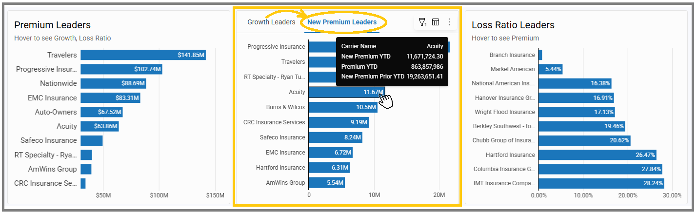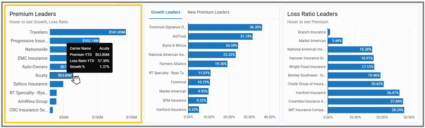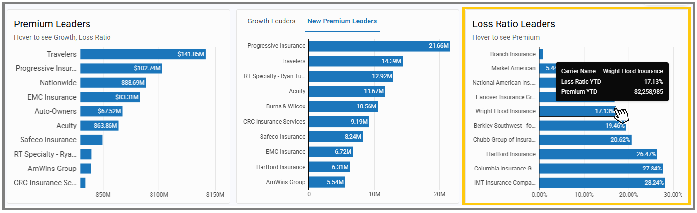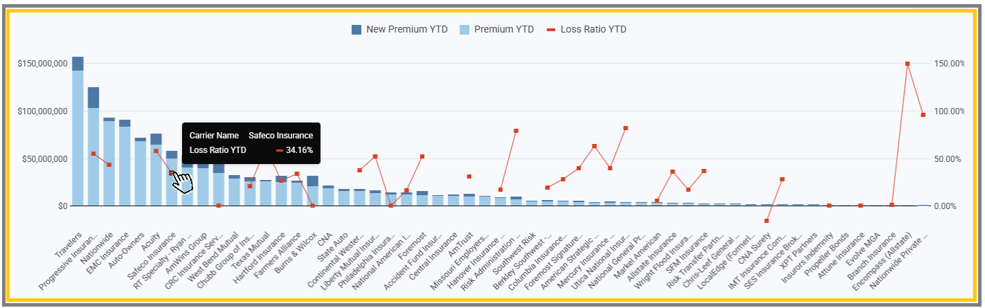This overview provides a balanced look at both production and performance—helping you quickly spot which carriers are driving the most premium, which are bringing in new business, and how they’re performing from a loss ratio perspective.