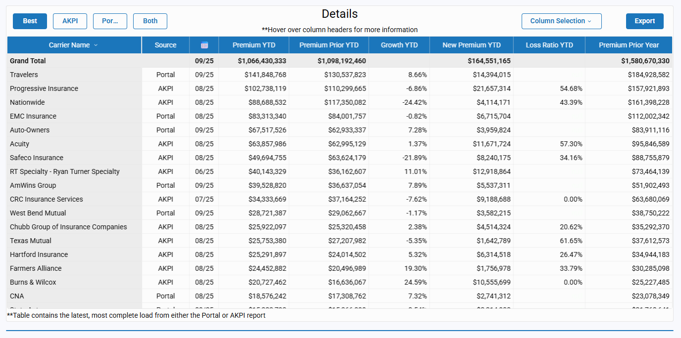 Note: In some cases, portal values may be displayed in place of AKPI values when both sources are provided. This typically occurs when historical data (such as prior-year months) is missing from the Carrier Production report. Using the portal source ensures the view remains as complete and accurate as possible.