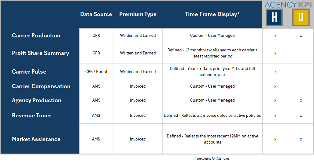 Written Premium may differ from Profit Share (Carrier Production aligns all results to the user-selected timeframe, while Profit Share aligns each row to the carrier’s last available month — meaning their totals will most likely not match).