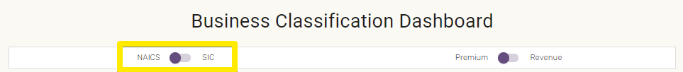 NAICS or SIC Code View of Dashboard May 13, 2023 1.On the main Clarity Dashboard. 2.Under “Business Classification Dashboard,” click the toggle button to switch between NAICS/SIC codes.